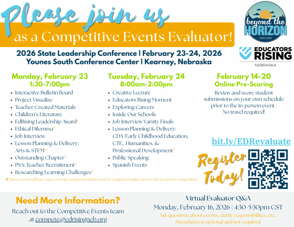 An Evaluator Q&A will be hosted via Zoom on Monday, February 16 from 4:30-5:30pm CST, where event information will be shared as well as provide time for evaluators to ask questions. It is not required to attend this event.